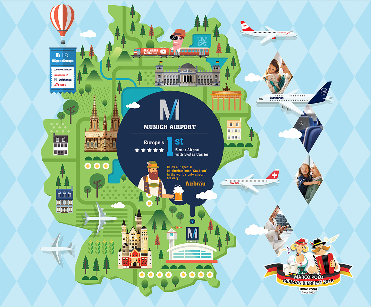 Being one of the official sponsors, Lufthansa Group and Munich Airport (5-Star carrier and airport nominated by Skytrax respectively) aimed to boost ticket sales and promote their social media channels during this exclusive gastronomic event. Targeting fun-loving guests who appreciate German culture with an eye to quality, an infographic backdrop has been designed to lure passers-by with a vibrant palette which set a welcoming and humorous tone to voice. Visualizing the details with an array of famous landmarks featuring Reichstagsgebäude, Brandenburger Tor, Kölner Dom and Schloß Neuschwanstein as well, the illustration also emphasizes Airbräu – the only airport brewery in the world, with its special beer “Gaudium” offered only at Munich Airport.