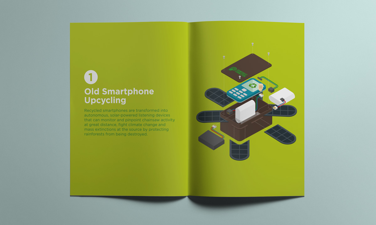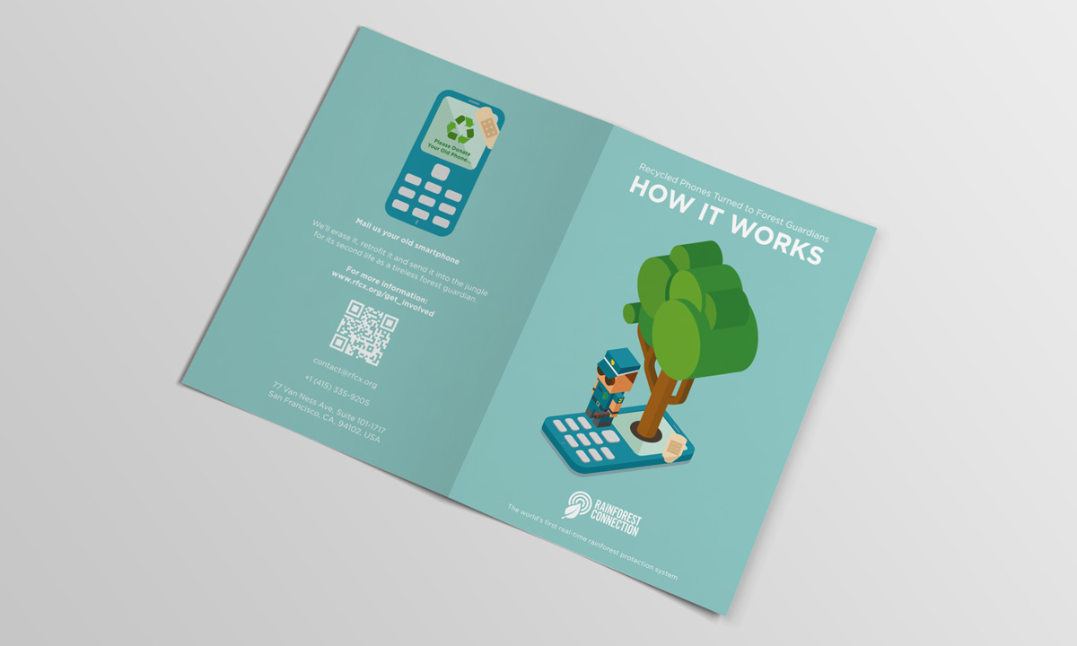This self-initiated project is intended to develop a marketing collateral redesign for the Rainforest Connection (RFCx) that helps promoting their goal of action against illegal logging in rainforests. Infographic presentation is explored to succinctly visualize the mechanism of detection system and the old smartphone upcycling process.