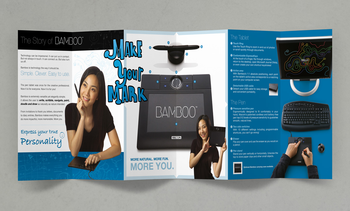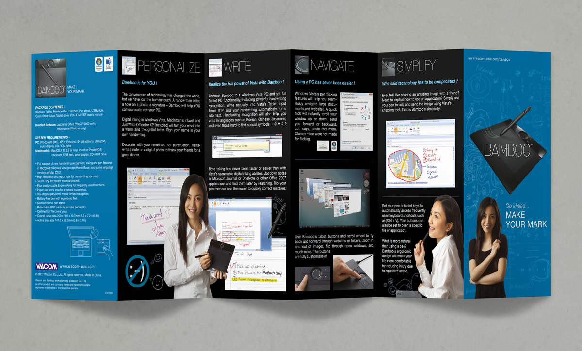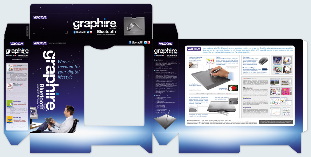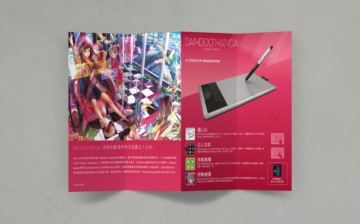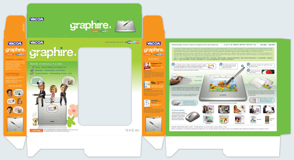 As the design agency of Wacom Asia Pacific and Wacom China since 2001, we are responsible for the graphic design and localization of packagings as well as related collateral materials, which includes the series of Intuos, Graphire, Cintiq & Bamboo, etc.