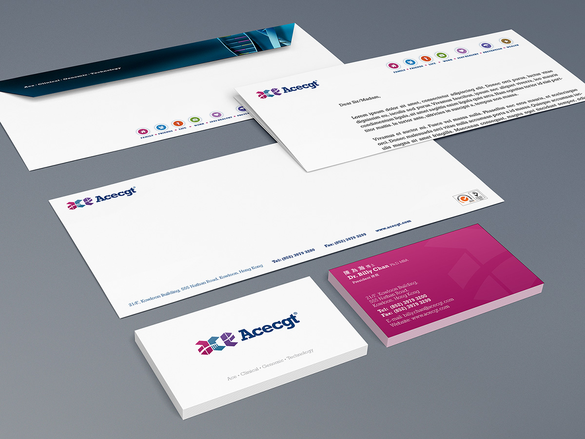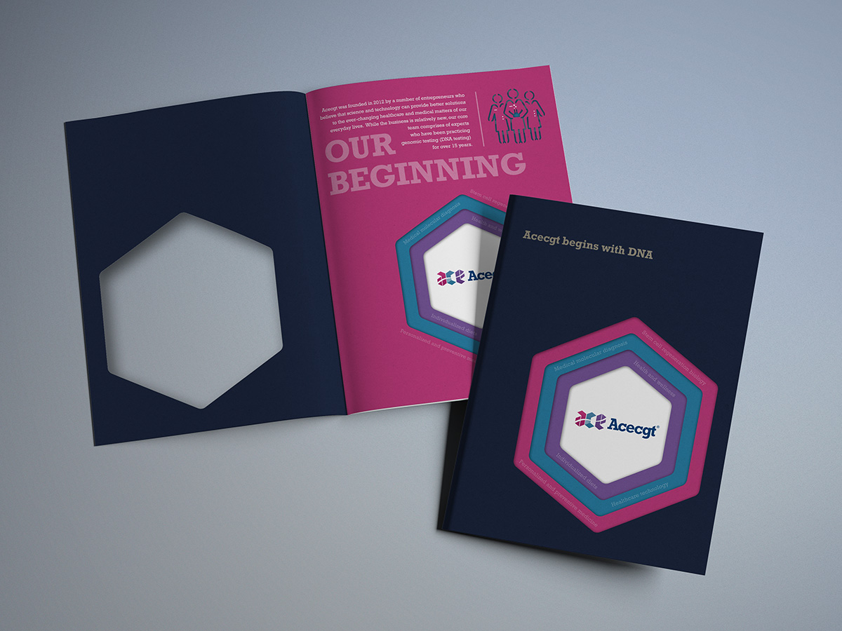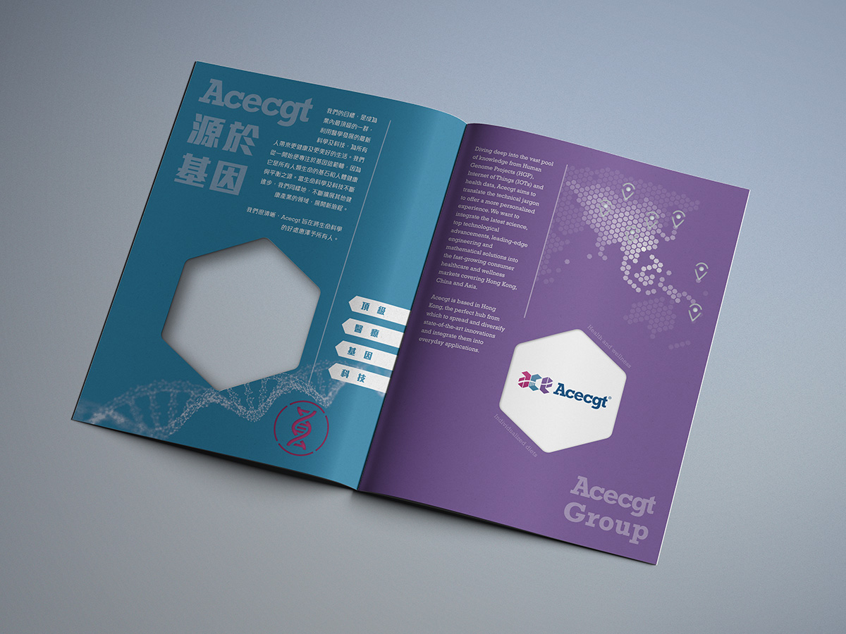 Hexagonal shape is used as the basic element of the logo, it represents their business model is built upon the spectrum of six technology areas - (1) Stem cell regeneration biology, (2) Personalized and preventive medicine, (3) Medical molecular diagnosis, (4) Individualized diets, (5) Health and wellness, (6) Healthcare technology. Designing with negative space, the entire graphic of “ace” is visually connected by the silhouette of DNA helix.