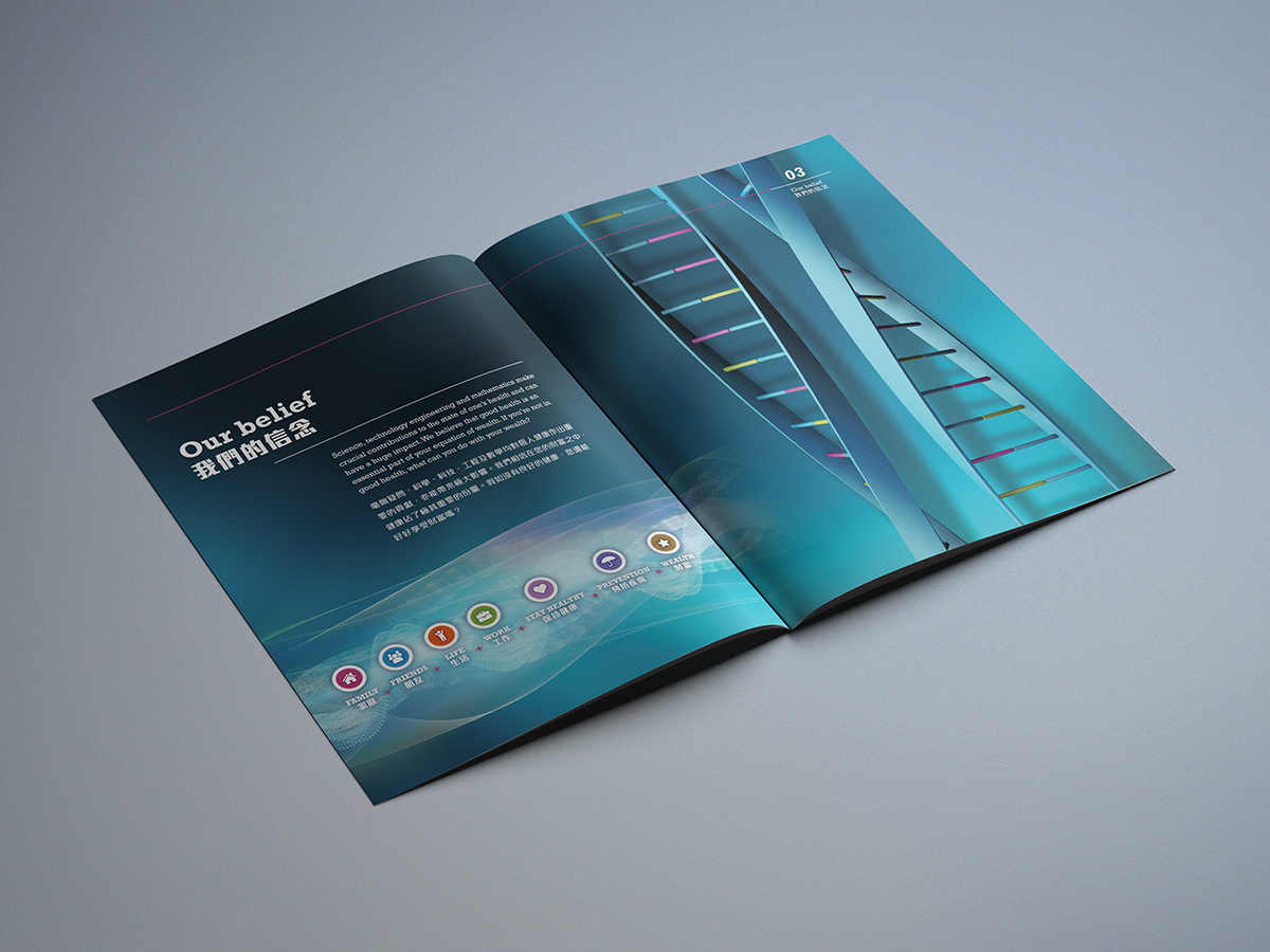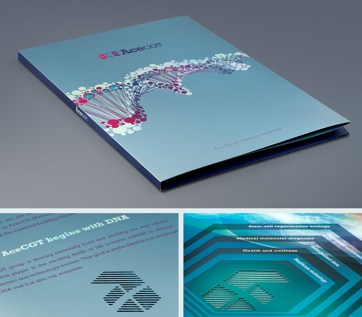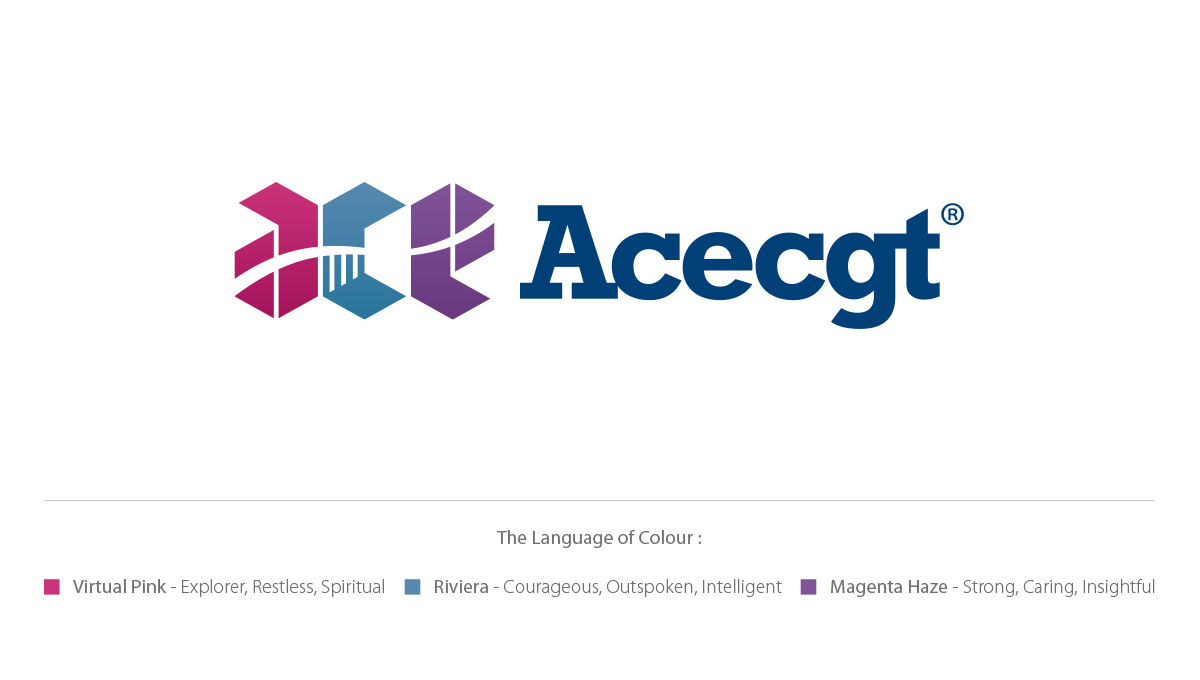 Hexagonal shape is used as the basic element of the logo, it represents their business model is built upon the spectrum of six technology areas - (1) Stem cell regeneration biology, (2) Personalized and preventive medicine, (3) Medical molecular diagnosis, (4) Individualized diets, (5) Health and wellness, (6) Healthcare technology. Designing with negative space, the entire graphic of “ace” is visually connected by the silhouette of DNA helix.