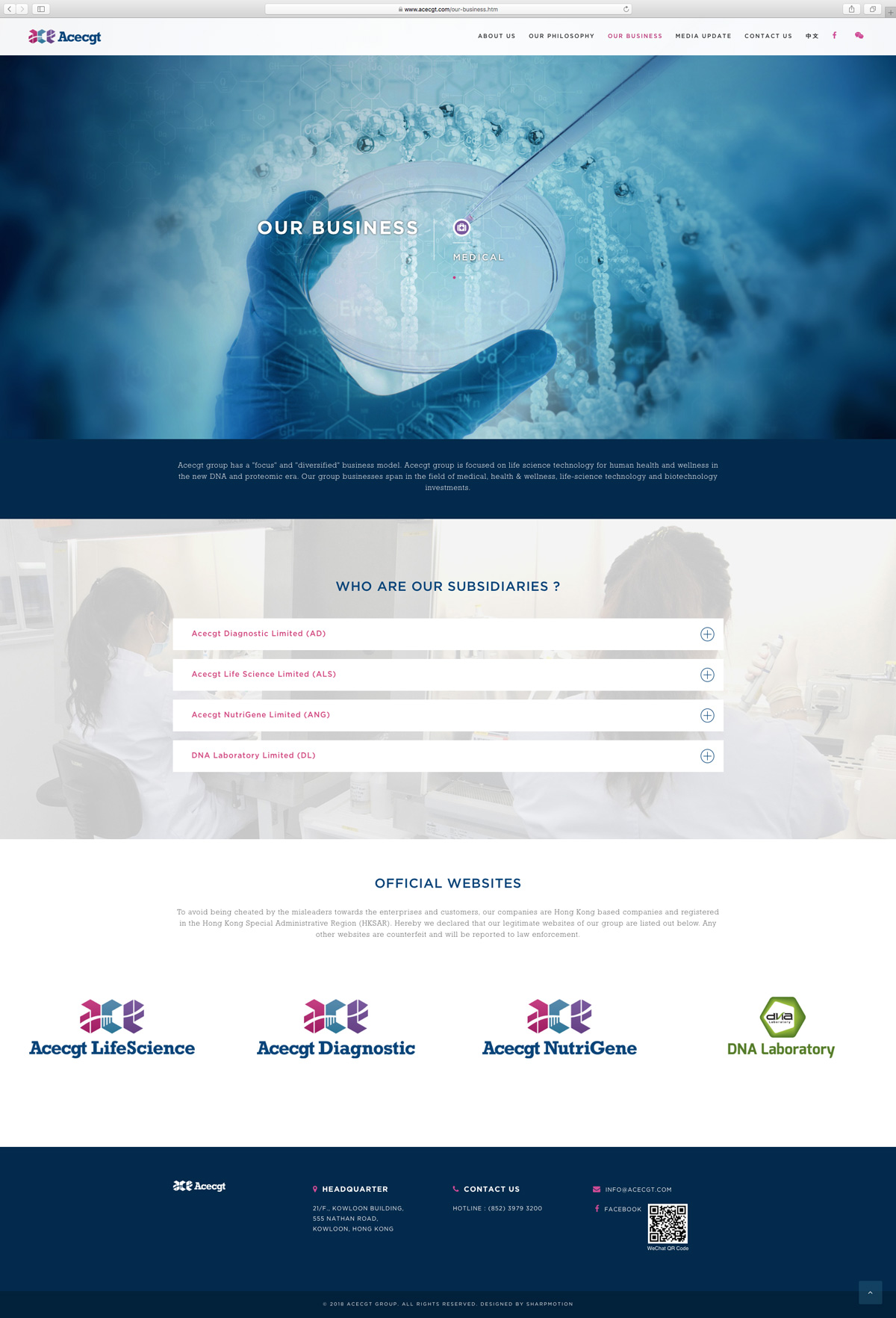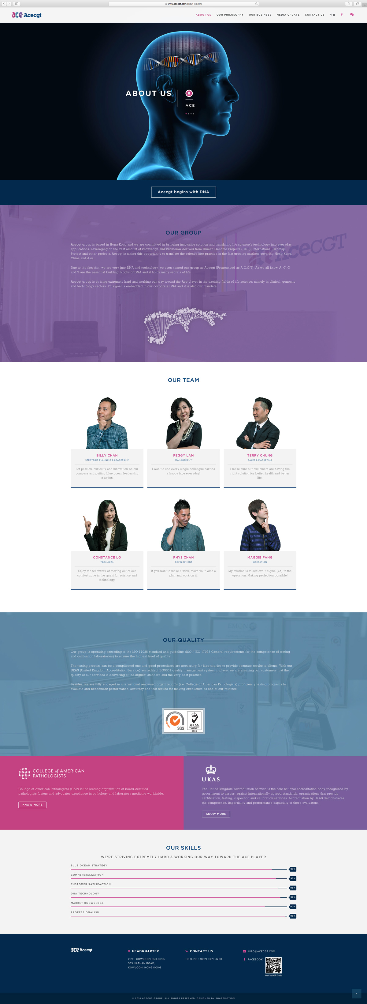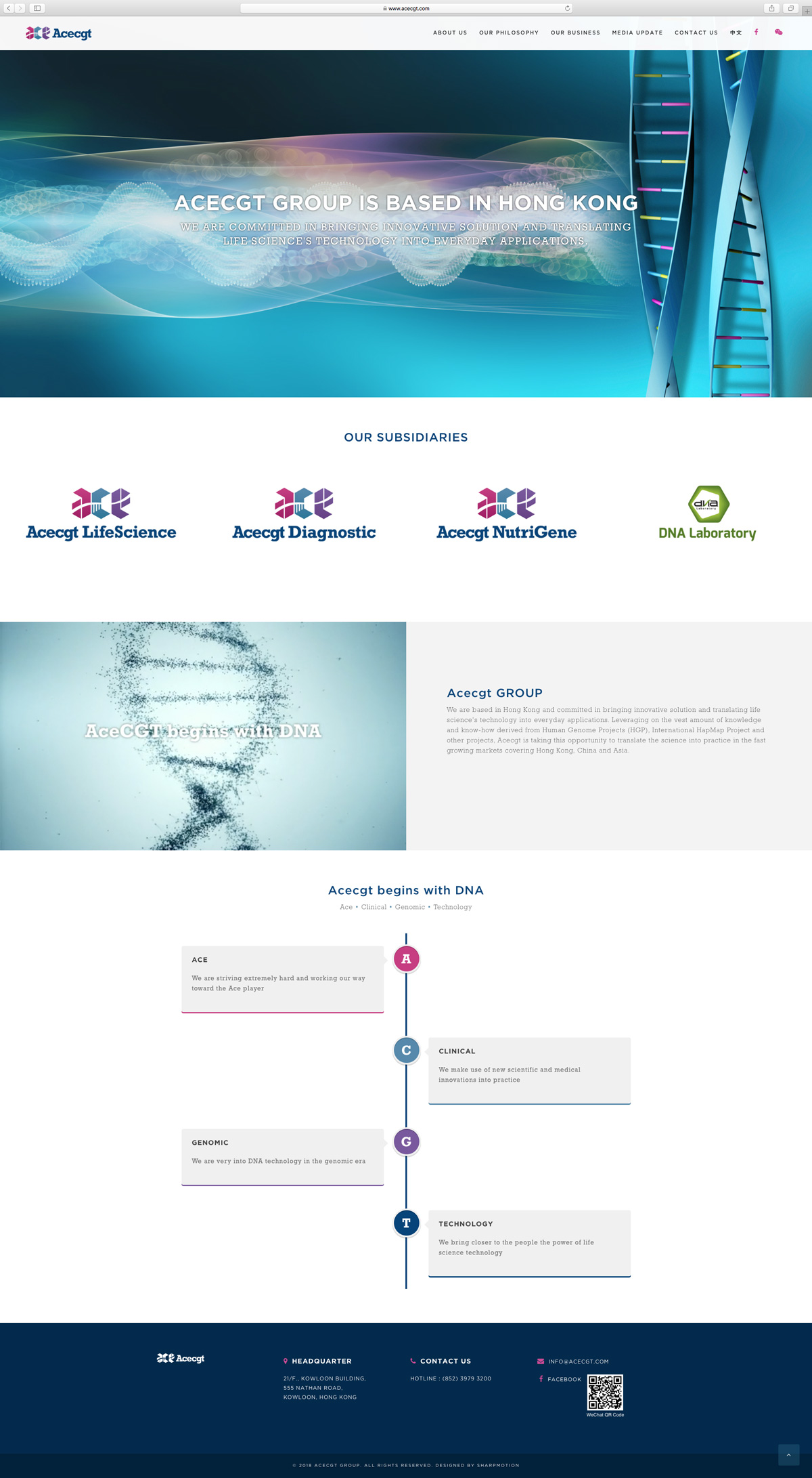 Acecgt group is based in Hong Kong and committed in bringing innovative solution and translating life science's technology into everyday applications. Leveraging on the vest amount of knowledge and know-how derived from Human Genome Projects (HGP), International HapMap Project and other projects, Acecgt is taking this opportunity to translate the science into practice in the fast growing markets covering Hong Kong, China and Asia.